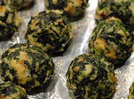 2 c. stuffing mix (crumb type) 3/4 cup melted butter (Ok not that healthy but what about all that green hmmnn?) 1/2 tsp. thyme 1 tsp. garlic salt 1/2 tsp. pepper 6 eggs 1 1/2 lg. onion, chopped fine 1/2 c. Parmesan cheese Cook spinach and drain really really well. Add other ingredients and mix really really well as well. Shape into balls. Bake at 375 degrees for 20 minutes. These freeze really really well; actually it’s better to bake them just a little to hold the shape before freezing; then finish when ready to use. NOTE: If the mixture appears too runny to form into balls, wait a few minutes for the liquid to be absorbed; if necessary you can add more crumbs.